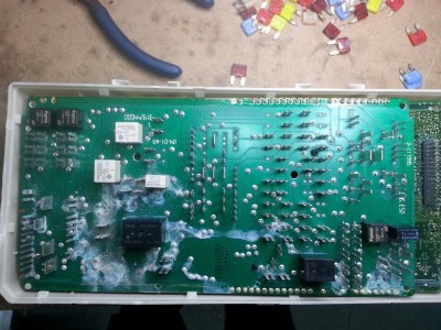 GEM je před spolujezdcem ve spodní části palubky, pod kastlíkem, jak je uvedeno v minulých příspěvcích. Uvnitř té krabice je plošný spoj, ke kterému vede přes konektory spousta drátů. Když se dovnitř dostane voda, může to dopadnout i takhle: