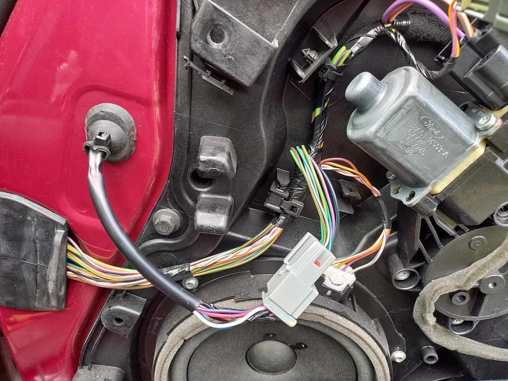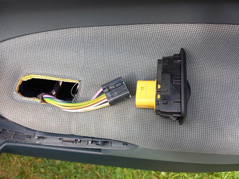 Zde je krásně to prodření vidět: Takto to má správně vypadat. Vodiče prochází gumovou průchodkou a kus ke konektoru ještě v bužírce: To už ale bylo pro automechanika asi moc práce, gumovou průchodku nechal uvnitř dveří a ven vytáhl jenom vodiče a konektor umístil přímo k díře.