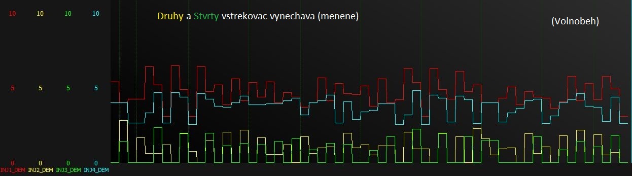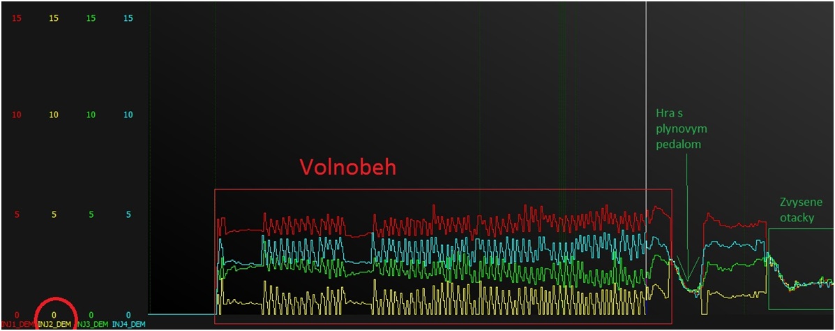 Na diagnostike to vyzeralo takto: - Fuel demand na druhom vstrekovaci boli take nizke az poziadavky klesli na 0, cize vobec tam ako keby nechcel palivo vstreknut.