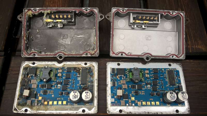 Až teď se dostanu k rozebrání. Vyměním H7 (sice svítí, ale jedna už to má za pár) a kouknu na ten předřadník...jak psal vitut a na jiném fóru jsem našel, že někdo úspěšně přeletoval jeden tranzistor...a vzhledem k tomu, že to je umístěné pod světlem a voda se tam mohla dostat, vypadá to na dobrý směr, ale nejsem elektrikář... :D
