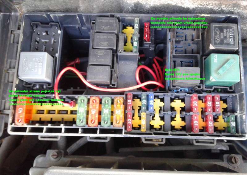 Dle knížky "Jak na to" od Etzolda jsou pro klimatizaci dvě pojistky. Pojistka č.45 v hlavní pojistkové skříňce a pojistka č.15 v přídavné pojistkové skříňce, prakticky hned vedle relé R11. V mém případě ale tyto pojistky nejsou vůbec osazeny! Bez schema tedy nejsem schopen zjistit, odkud je ve skutečnosti u mého Focusu vlastně ten přívod +12V k relé veden.