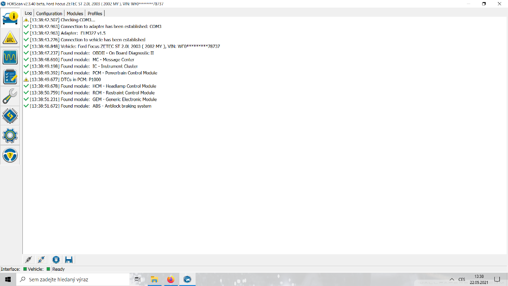 Ahoj. Mám Focuse ST170 2002, stáhl jsem si Forscan (extended license) a pořídil ELM327 s HS/MS switchem. Bohužel mi forscan najde chybu P1000 a nenačtou se všechny moduly. V konfiguraci to píše CAN ERROR: 3 (0.8%). Nemáte s tím někdo zkušenosti?