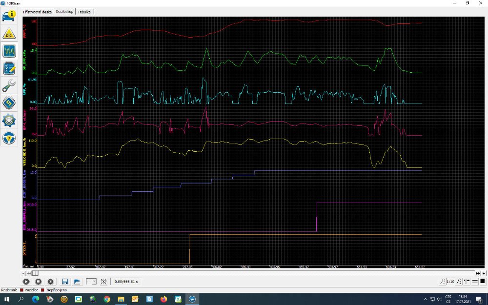Naměřené hodnoty přikádám. Je tam postupně teplota filtru, rozdíl tlaků na filtru, poloha pedálu, otáčky, rychlost a další. Na druhém snímku jsou ještě otáčky (v procentech) sahary.