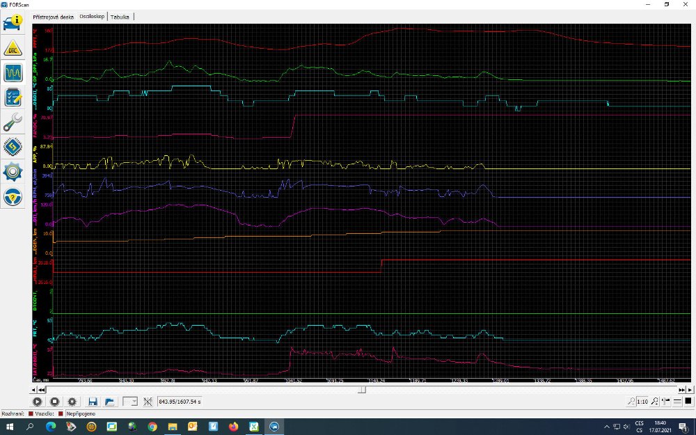 Naměřené hodnoty přikádám. Je tam postupně teplota filtru, rozdíl tlaků na filtru, poloha pedálu, otáčky, rychlost a další. Na druhém snímku jsou ještě otáčky (v procentech) sahary.