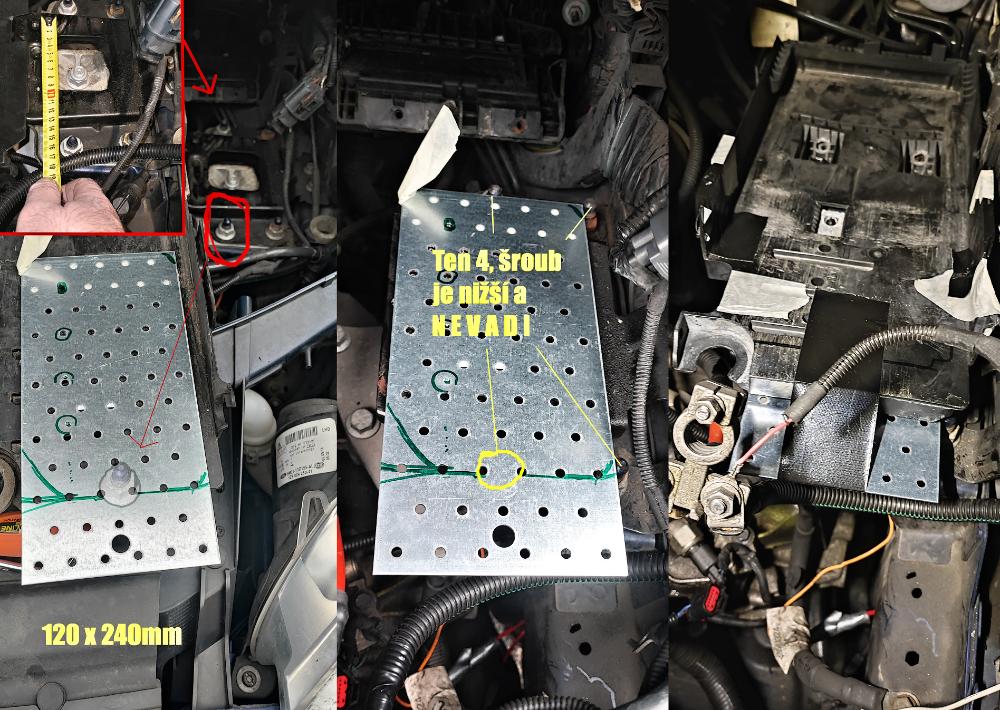 Držák není přišroubován uprostřed, ale 3cm od kraje. Vnitřní šířka od kraje nosníku v autě je po konec baterie je cca 12.5cm. Krásně to vychází na truhlářské desky 120x240 mm I ta 3. řada děr je cca 3cm od kraje a dokonce dvě ze 4 vycházejí docela OK.