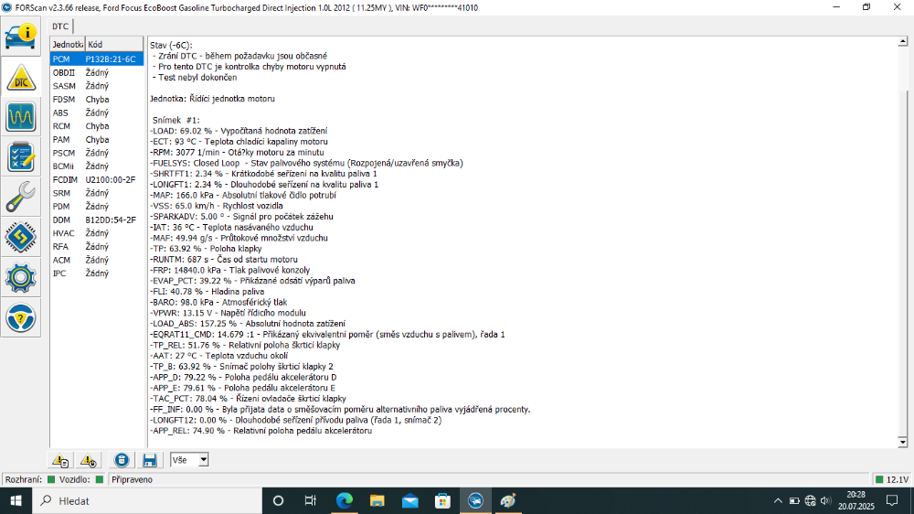 Chyba se projeví až při větším zatížení 3500-4000 ot. ŘJ turbo odstaví viz log z forscan vyznačeno bílou čarou.
