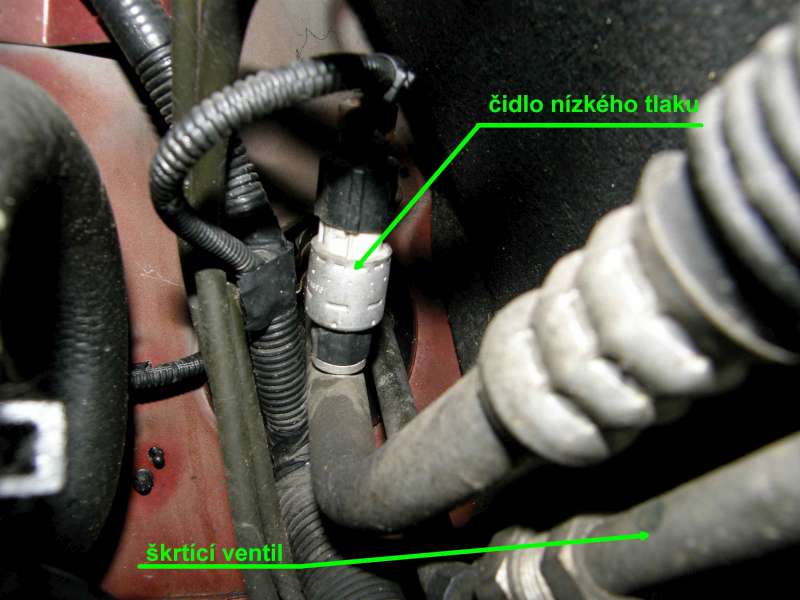 Dalšími důležitými komponentami jsou čidla tlaku: Čidlo nízkého tlaku se nachází na přepážce motorového prostoru a přístrojové desky na větvi vedoucí od výparníku ke kompresoru. Toto čidlo se nachází v blízkosti sušiče v blatníku PP kola. Je přístupné po odmontování plastového podběhu.