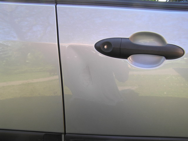 Chtěl bych se zeptat jestli jde nějakým způsobem tuhle promáčklinu opravit. O kytování a novém laku nepřemýšlím - bylo by to dost drahý a nevím, jestli by se chyt stejný odstín...