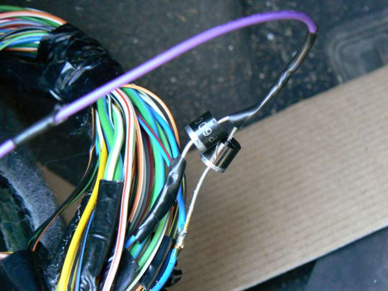 Tak pro zapojení funce odemykání a zamykání se musí najít černozelený (odemknutí) a černooranžový (zamknutí) ve svazku jsou různý průřezy stačí vyloučit ty nejslabší a ty silný ten náš má 0.5 mm.To jsou oni:] Černozelený se spojí se žlutým na DO a černooranžový pak s hnědým.Nezapomenout spojit na DO modrý se žlutočerným a černým který se ukostří.Kostru jsem mimochodem dal pod ukostřovací šroub,který je o kousek víš na sloupku.Ted blikny.Blinkry se připojí na modrý a modročervený kablíky (ve svazku tamtéž) a jsou silnější jak ty na centrál tady je potřeba oba kabely oddělit diodama katodou do svazku zvlášt na modrý a modročervený, anody se připájejí k sobě a spojí s fialovým z DO..Dále je na řadě kufr.Ten se zapojí na černožlutý a na DO s růžovým.Ten já zapojil do svazku nad konektorem,ale to jen proto,že byl prostě na vrchu určitě povede i ve svazku v prahu.