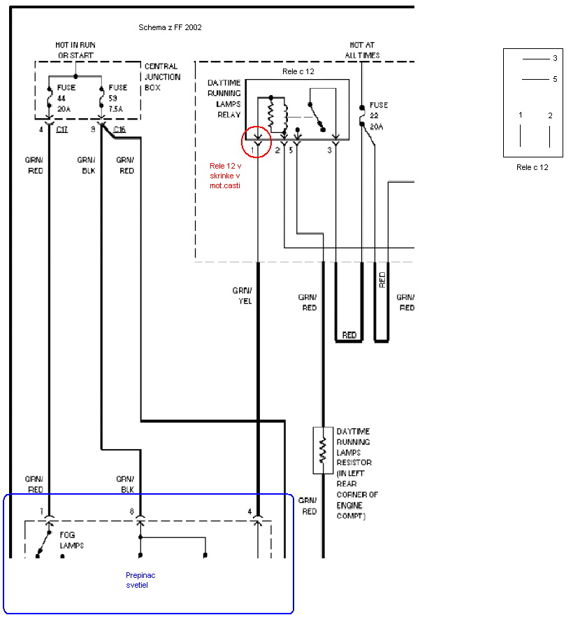 Takze na obrazku (schema) ako to vidite je zapojenie FF 2002. Ja mam 2003 a v podstate to sedi...a to automaticke zapinanie by aj fungovalo...ale pin 1 rele 12 u mna podla tej schemi tak zapojeny nieje a neviem prist na to kam to je zapojene.