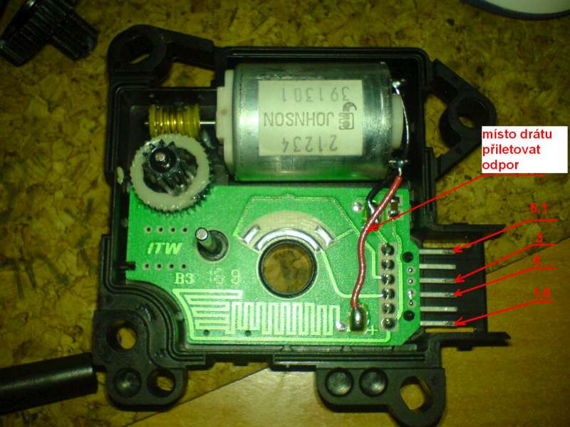 Na závěr jsme vodivé části odporů zakápli tavnou pistolí (kvůli případnému zkratu - je tam opravdu málo místa). Vzhledem k tomu že motorek pracuje občas a krátkou chvilku, nehrozí případné zahřívání odporů.