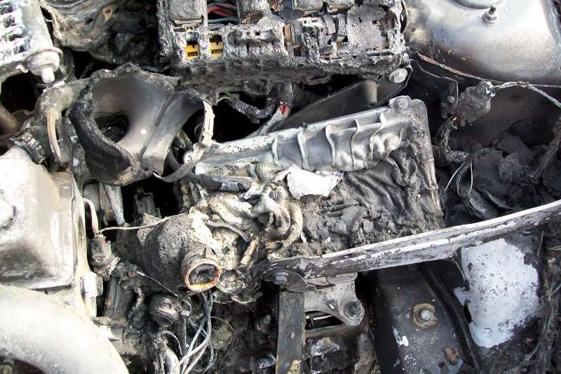 Takže výsledek - komplet motorový prostor na odpis, poškozené čelní sklo, elektroinstalace v motoru a okolí nepoužitelná. Interiér nepoškozen (snad jen trochu výduchy ofuků skel), jinak nebyl ani zakouřený. Škodu jsme odhadli, uchráněn zůstal interiér a celý zadek.