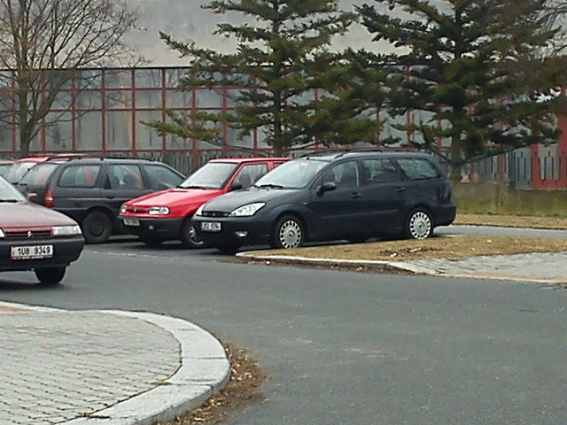 Focus kombi po FF, tmavě modrý, klubové podložky, Baarova ulice.