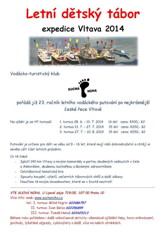 Jsem jeden z mnoha vedoucích tohoto vodácko turistického klubu Suchá Noha a rád bych pozval děti na vodácký tábor kde se zažije spousty srandy, dobrodružství, her a hlavně se člověk naučí starat sám o sebe(v přijatelné míře). Vše potřebné se najde na webu Suché Nohy.