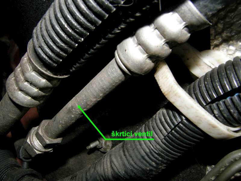 Poslední důležitou součástí je škrtící ventil (funkce viz. předchozí příspěvek) Škrtící ventil je taktéž na přepážce motorový prostor - přístrojová deska a vlastní ventil je uvnitř trubky vedoucí k výparníku a vypadá takto: