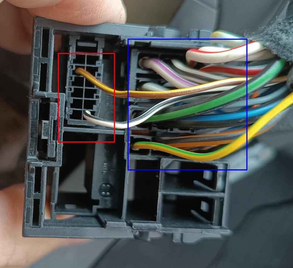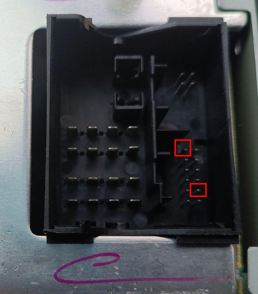 Modře je označený konektor, který je plně osazený a s tím funguje všechno, kromě toho DO. Červeně je originál konektor se 2 vodiči- čistě jen na to DO. Fotka je originálního kusu, co byl v rádiu, ale teď je zastrčený v tom "prodlužováku. Pak je vyfocený samostatný konektůrek, který je vycvaknutý z origo konektoru a tyhle 2 vodiče jsem cvaknul, prodloužil a napájel na konec ty dutinky. Poslední fotka je přímo rádio, kam jdou ty 2 dutinky. Pro jistotu, jaké to je rádio:
