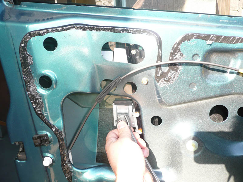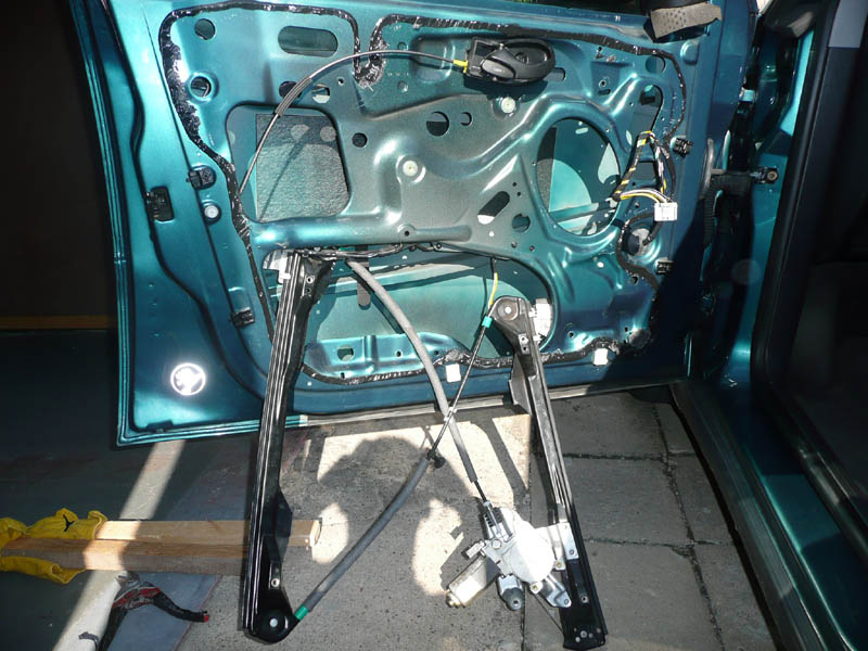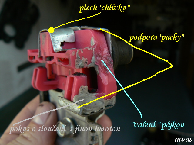 Slabší nátury si smlsnou už při odlepování tapecírunku od tý matlavý černý hmoty při snaze zachovat ji alespoň trochu při sobě (první myšlenky dezerce) Po překonání této překážky a vyndání stahovačky ven po letmém prohlídnutí se ukázala závady.Byla prasklá jedna z umělých hmot.Na fotu je jezdec z druhé strany kde byla jen naprasklá jedna packa. Tu jsem nahradil kouskem umělý hmoty s vyříznutou drážkou prostě tak aby plnil původní funkci,přišroubavaný jedním samořezným vrutíkem.Na druhý straně byly tyto packy obě,ale jedna už naprasklá a bylo by jen otázkou času kdy by umřela taky.Tu jsem vyztužil plechema v místě kde byla hmota prasklá pájkou roztavil-zavařil.Zkoušel jsem na to nakapat roztavenou jinou umělotinu,ale ta nechytala (šedá hmota.)No a taky tam byl prasklý jeden konec chlívečku na zarážku co je na lanku tj.okno by dolů táhlo,ale nahoru by jelo lanko samotný hmotu by netáhlo (každý,kdo se do toho pustí či pustil ví o čem je řeč) no a to jsem taky spravil kouskem plechu.Víc fota. Každopádně nejhorší na celé opravě bylo zamotaný lanko na kladce.To bylo fakt hustý! Samozřejmě se pokroutilo.To jsem co nejlíp porovnal kleštěma,pozor na sploštění.Dřív se však musí sundat motorek s mechnismem to jsou tři torx šroubky,kladka jako taková sundat nejde.Potom ručně navinout lanko tak jak má být a vrátit motorek,následovalo nasazení lanka na všechny kladky jde to blbě,ale na vrchu zelené kladky je šikovný excentr,který velice usnadní konečné nasazení.Během celý operace jsem několikráte potřeboval elektricky popojet s lankem ( s motorek lankem nehnete) tady jsem využil svůj laboratorní zdroj z minulosti kdy jsem ještě kutil elektroniku protože přenášet celou stahovačku ke dveřím je nepraktický otravný a špatně se s ní pracuje.Pozor! na jakékoliv popojíždění poku ještě lanko není nasazené na VŠECH kladkách si vemte pomocníka,který vám bude lanko napínat,nebude-li napnuté bude se špatně navíjet (přes sebe) a můžete začít znova.A jak máte lanko na místě je vyhráno.Potom nějakým způsobem dostat stahovačku do dveří na své místo máznout vazelínou ( já grafitovou) a můžete si mnout ruce,že jste ušetřily 8500 kaček + práci v servisu,nebo v lepším případě 1500 za stahovačku o které nic nevíte a jejíž životnost je ve hvězdách.Mě to nestálo nic krom pár pivek.Jiná otázka je jaké moje práce bude mít trvání.Každopádně v případě problému dám vědět.Jo a ještě jeden dojem stahování je o proti dřívějšku krásně tichý paráda.