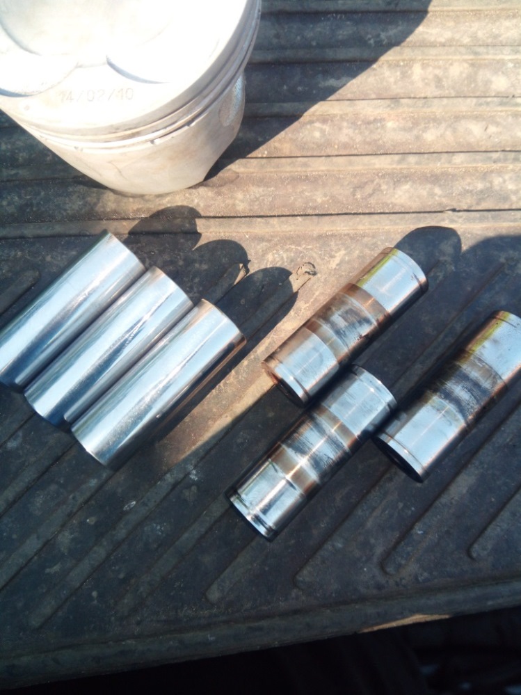 Ahoj všem,přikládám pár fotek pro ilustraci jak vypadají písty po vytažení ,v prúběhu čištění v ultrazvuku, přečepování a těsně před zpětnou montáží.(Tohle byl trochu extrém,kýbl karbonu a čepy obroušený o 0,35mm,zřejmě provoz na uhlí.typ SYDA)Hlavně je hezky vidět ucpaný mazací kanál čepu.