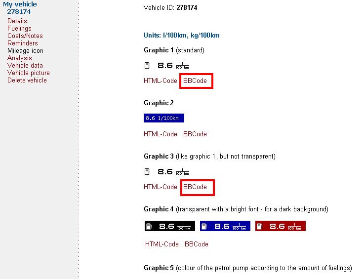 v lavom stlpci si klikneš na mileage icon a ukáže ti niekolko typov zobrazenia tvojej spotreby. Vyberieš si ,ktorý sa ti najviac páči (ja mám ten prvý Graphic1) a klikneš na BBCode nasledne ti vygeneruje kod, ktorý si celý skopíruješ a vložíš do svojho podpisu v nastaveniach svojho profilu na fore