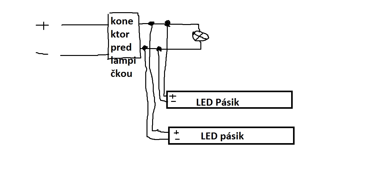 A ešte ti priložím schému zapojenia tých LED pásikov k tej žiarovke, čo je v kufri. Ospravedlnujem sa za nákres v skicári, ale momentálne nemám času nazvyš, tak len takto narýchlo.