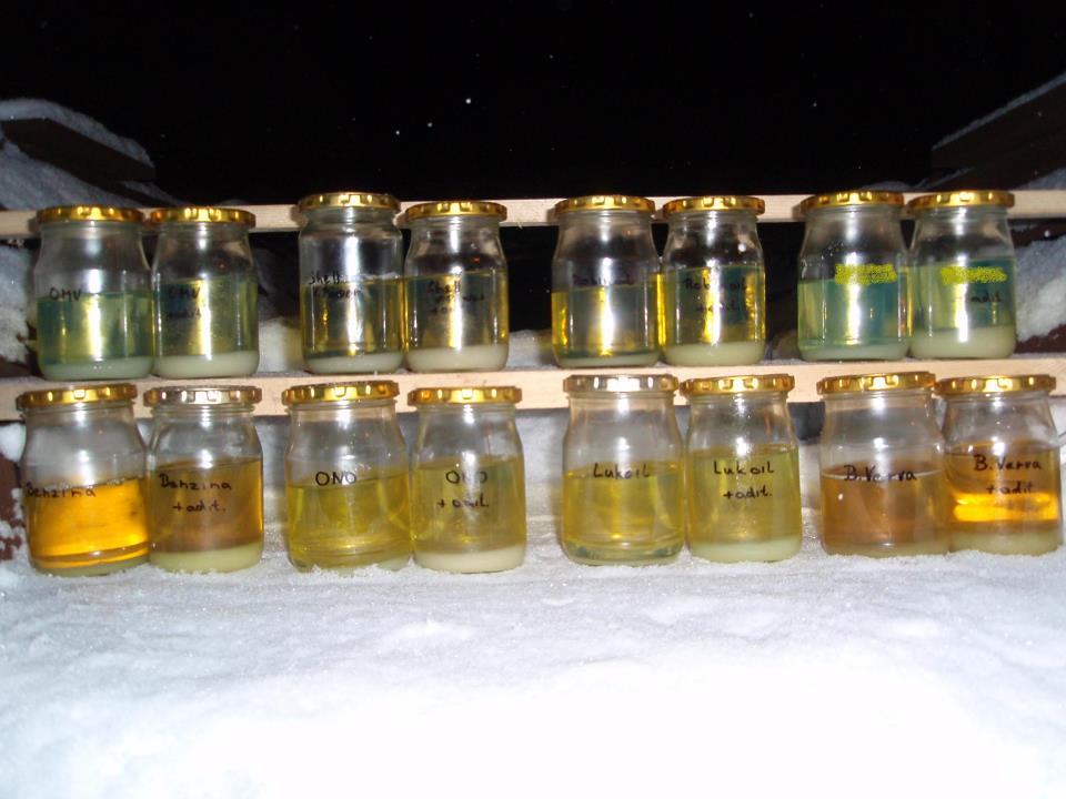 Nej byla AGIP arctic, OMV arctic a benzina TOP Q (bez jakyho koli zakalu), zbytek zakaleny do mlecne zluta, ale vse OK, jelikoz kristaly parafinu byly rozptyleny po cele plose, kdyby pry sedli na dno, bylo by to spatne. Pak tam meli jeden vzorek "letni" nafty a ted mel usazeny parafiny na dne, pridali do nej VIF v dvojnasobnem mnozstvi a nechali dalsi noc venku a uz to bylo lepsi - vse rozptyleno