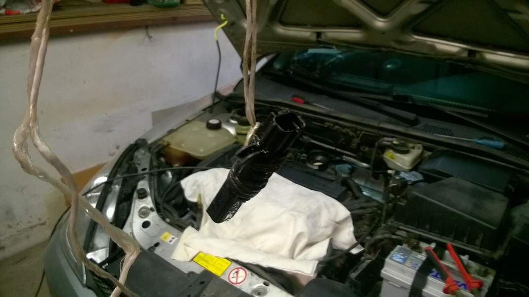 Tak dnes jsme se dali na výměnu čidla. Vše ze shora, šestnáct let staré čidlo. Šlo to pomocí provázku, zaháknout ho smyčkou, druhý konec omotat o násadu a následně páčit o motor.