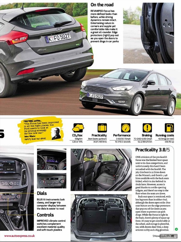 Focus - predek nazivo vypada lepe, nez na fotkach. Zkratil se ale LED pasek denniho sviceni ve svetlech, uz to nevypada tak "nabrousene". Z boku je to prakticky stejne, vzadu jen mensi svetla, jinak taky tak nejak stejne. Uvnitr uz je to lepsi. Trochu jina sedadla - prisla mi sirsi, nez mam ja, takze bych v nich asi i pres slusne bocni vedeni pomerne lital, pri me postave. Volant dobry, tlacitka jsou lepe dosazitelna. Budiky stejne, jak mam ja, jen se na barevnem PP zmenila grafika (stejna, jakou maji v USA pred FL) a pribyl druhy trip computer. Stredova konzola je prekopana. Madlo brzdy se presunulo vzad na standardni pozici, to vidim jako minus (zvykl jsem si na to predsunute), zmensila se schranka v loketni operce. Drzaky na piti jsou kryte roletkou, jako treba v Mondeu. Kolem radici paky jsou tlacitka na zapnuti ohrevu volantu, automatickeho parkovani atd. Panel klimy je jiny a pripada mi mene prehledny, nez dosud, ale to je asi jen zvyk (2 generace Focusu se soucasnym resenim:). Auto melo dotykovou 8" obrazovku - prijde mi to zbytecne - ano vypada to lepe, navigace na tom bude urcite prehlednejsi, ale obrazovka je celkem daleko a utopena v pristrojovce. Nevim proc bych mel ovladat klimu pres toto rozhrani, kdyz par cm pod tim je k tomu urceny hw panel. Asi bych se klidne spokojil se zakladnim (pro Titanium) 4" LCD, jako mam ted a poradnymi tlacitky pod tim. Mimochodem tento 8" system meli v USA uz pred FL - takze je to vlastne takove vylepseni-nevylepseni, Ford to nic moc nestalo
