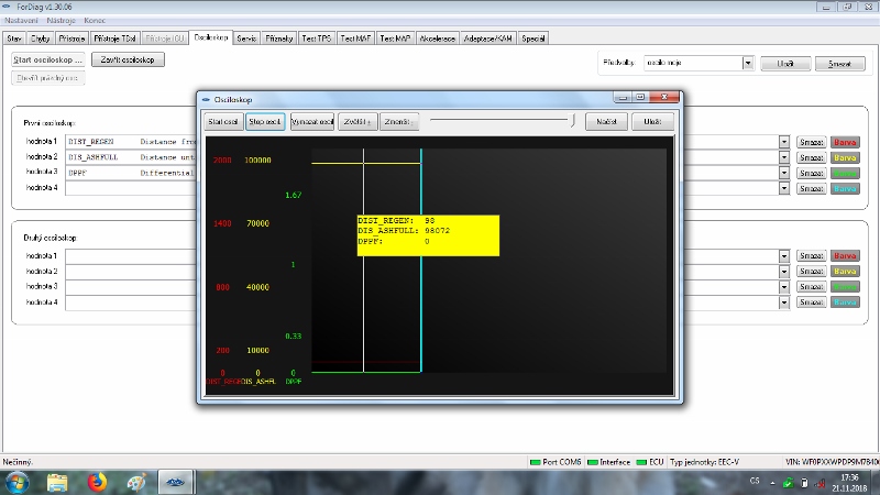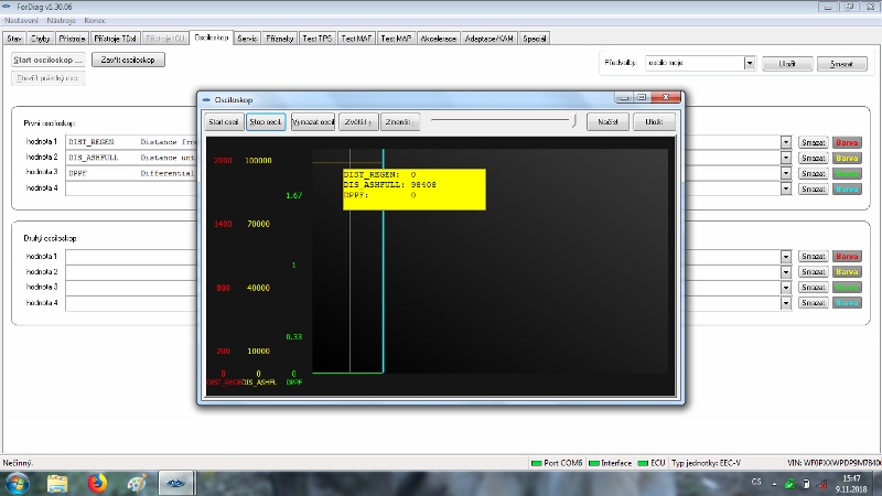 po výměně filtru DPF a resetu mi "Distance Until DPF ash full" odpočítávalo km od 100 000km.Po ujetí 2000km od výměny vyčištěného originálního DPF. Protože při první výměně DPF (nový DPF) jsem měl zkušenost že při ujetí 2000km se změnilo odpočítávání km na "Distance Until DPF ash full".(Proč jsem měnil znovu DPF byla spálená hadička na kontrolu tlaku před DPF a po zjištění a výměně už bylo pozdě a filtr se rozpad).Protože jsem to tenkrát hlídal,tak mě zajímalo jestli se to bude chovat stejně a stalo se to samé a to po ujetí 2000km se na "Distance Until DPF ash full" změnilo odpočítávání km.Vyčítal jsem to při ujetí 1950 km po resetu a výměně DPF a to odečítalo km od 100 000 km takže tam bylo 98050km. Po ujetí dalších 90km jsem nechal znovu vyčíst a zjistil jsem že "Distance Until DPF ash full" ukazuje cca od 400km a km od té doby přičítá.Při každém měření to přičítá km,ale nerovná se to skutečným ujetým km.Přitom interval regenerace filtru probíhá pořád po stejných km,pohybuje se to mezi 200km - 240km.Ani rozdíl tlaku před a za filtrem se nezměnil na volnoběh.Proběhla tentokrát i kontrola vstřiků - na testovací stolici,egr ventilu - rozebrání a vyčištění (byl jen černý bez vélkých usazenin,čidla rozdílu tlaku,těsnosti vedení a čistoty intercooleru - byl bez olejea turba jen naklápěcí klapky v jednom místě trochu přidírali - zatím funguje.Tak by mě zajímalo jestli je to normální nebo ne,když po resetu (DPF) to km odečítalo a teď to km přičítá?Auto mám Ford Focus 1.6 TDCI 80Kw r.v.2009 najeto 278000 km.Diagnostiku používám Fordiag od Tomina s kabelem v 3.12. software ForDiag -1.30.06.Ještě bych přidal že jsem měl auto v servisu Ford Počátky a tam mi řekli že auto je v pořádku a u DPF mi provedli reset tak jsem znovu čekal co to udělá po ujetí 2000km od resetu DPF a zase to samé,po ujetí 2000 km od resetu DPF na diagnostice to ukázalo že "Distance Until DPF ash full" je 400km a teď to začne zase km přičítat.Jinak regenerace se pohybuje kolem 220 km až 230 km,spotřebe je průměrná 4.9 L/100km a jezdím teď krátké trasy a to 20 km do práce a 20km z práce.Že by se za autem nějak kouřilo to nepozoruji.