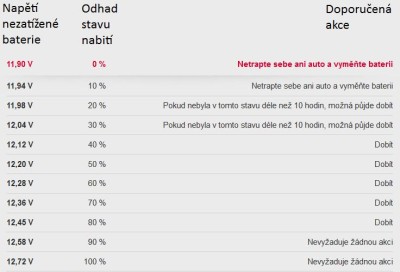 Pro obecné posouzení stavu baterie (stav nabití podle napětí) jsem před časem našel nějakou přehlednou tabulku v článku ze Světa motorů. Je nutné to změrit u "odpočaté" baterie, která není zatížená, tj. např. po noční odstávce a ideálně zvednout kapotu bez použití dálkového ovládání.norias píše: 04.10.2021 21:38Pokud nabijes baterku jizdou tak se logicky zvedne i napeti o par mV. Jak pak auto stoji tak se samovolne neco vybije a bud rad ze to drzi 12.1V...venca.mar. píše: 18.07.2021 15:26 Tak po 15 dnech co tu auto stojí tak má baterie 12,1V.To bude mít i za 14 dní,jen pořád nechápu proč spadne z těch 12,8 na tuhle hodnotu a pak už drží.![]()
