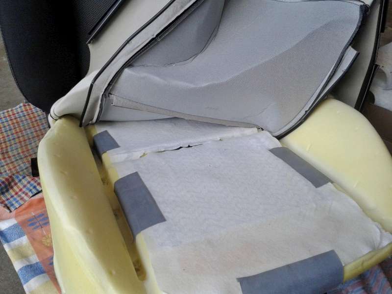 1) Vyndáme sedadlo z auta a uděláme si dostatek prostoru (nedokážu si představit dělat vše bez vymontování sedadel z auta, předevsím sundavání plastů). 2) Na těchto místech jsou 3 úchyty, které drží plast (na druhé, snažší straně, jsou pouze 2). Kolečko pro sklon sedadla silou k sobě vysuneme. 3) Zde jsou vidět úchyty. Červěně jsou označeny místa kde drží potah sedadla. Ten se musí silou vycvaknout. Žlutě je označený držák potahu se kterým je největší problém (na každé straně 2). Jde opravdu špatně vycvaknout a nejspíš ho pří demontáži poškodíte (nikaj to ovšem nevadí výsledné práci, není nic poznat) 4) Vycvaknutí potahu zespodu sedadla (provádí se asi na 3 místech) 5) Sundavání potahu 6) Potah je přidělaný k sedadlu kovovými kroužky. Zde se nebojte použít štípačky a kroužky přecvaknout (jinak to opravdu nejde, pokud u toho nechcete strávit týden) 7) Přestřihat stačí jen jedna strana a střed (pod zbytek už potah zasuneme rukou)