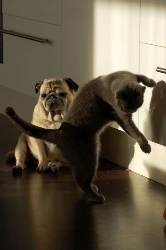Tak to je super sestava, pesan vypadá jako naprostej flegmouš,kočka na raubíře a papouch živě