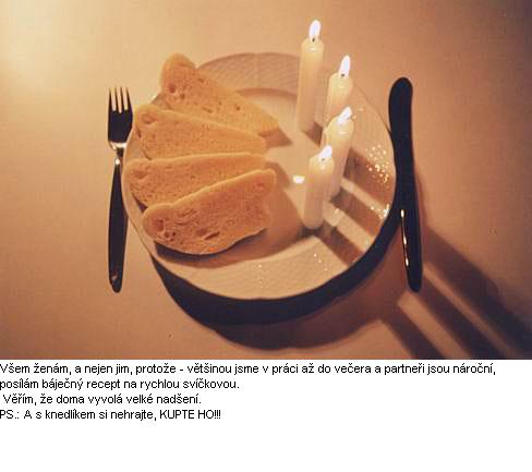 to Kasi: anžto se považuji za zaměstnanou ženu, řeknu k tomu receptu na svíčkovou, že ty knedle se polijou tím voskem samy, jak postupně stéká a přihřeje se to od těch svíček...