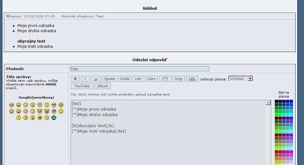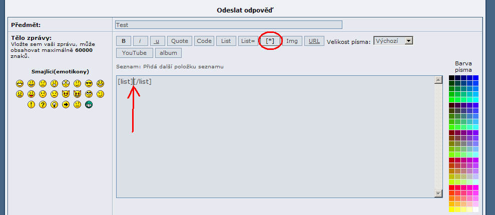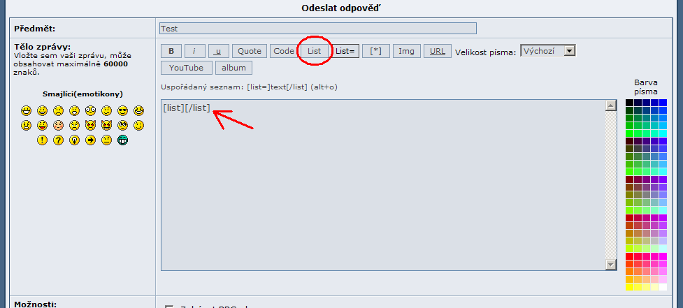[1] klikneme na List, do prispevku se vlozit HTML znacky seznamu [ list ] [ / list ] (bez mezer) [2] nyni budeme do seznamu vkladat jednotlive prvky (odrazky): kurzor musi byt umisten uvnitr HTML znacek [ list ] [ / list ], potom klikneme na tlacitko [*] pro odrazku [3] forum nam opet vlozi do texty znacku [*] a my napiseme text prvni odrazky. Pro vlozeni dalsich odrazek v textu bod [2] opakujeme, tlacitkem Nahled se muzeme podivat, jak bude vysledny prispevek vypadat: [4] az budeme spokojeni, prispevek odesleme tlacitkem Odeslat