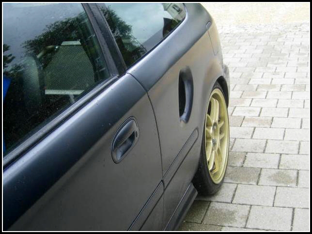 Aby všechno dostatečně ladilo, odstranily se kliky dveří a jejich místo bylo zavařeno, zakytováno a definitivně zahlazeno. Jejich funkci nyní plní dálkově ovládané elektromagnetické zámky. Z úplně stejného důvodu se ztratily prolisy také v předních blatnících. Boky jsou tak naprosto hladké a souvislé. Na konci zadních blatníků se vyřízlo místo pro zapuštění koncových svítilen z pětkového kombi a mezi světla bylo dodatečně vyrobeno zcela nové čelo. Absolutní karosářskou perličkou je mohutné použití karbonu, konkrétně na