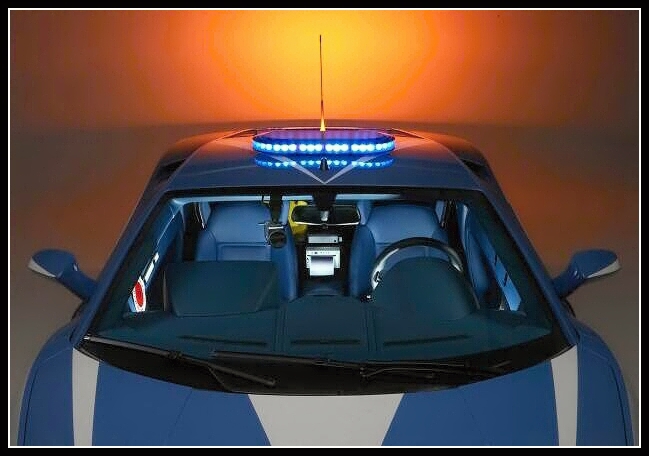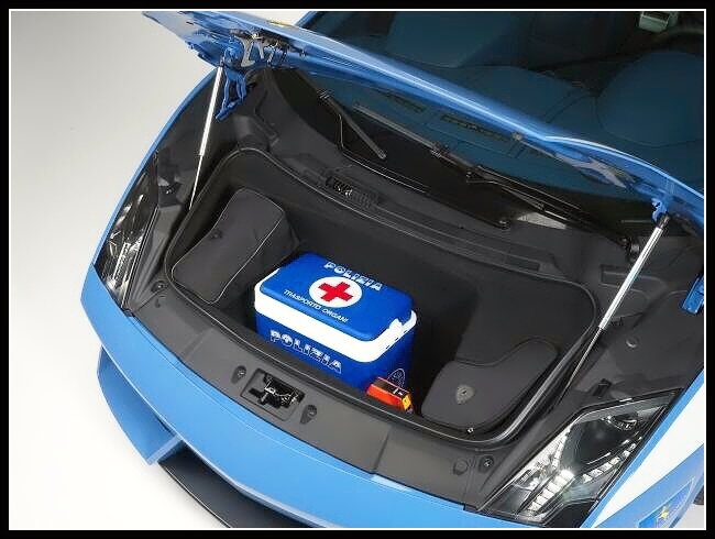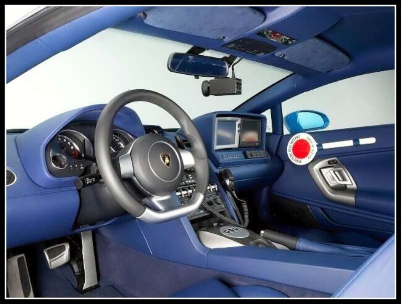Na druhou stranu by to nemuselo být za volantem policejního Gallarda až tak těžké, jelikož nízkou siluetu vozu dozajista vynahrazuje systém majáků. Kromě toho střešního je po celém voze ještě všude možně ukryto dalších šest modrých stroboskopů. Uvnitř se na čelním skle nachází kamera, na palubní desce dvojice monitorů, mezi sedadly tiskárna a taky tu je ukrytý počítač spolupracující přes GPS s centrálou. Každý zásah je tak plně monitorován. Aby to bylo z výbavy všechno, je nutné zmínit přítomnost defibrilátoru za sedadly a speciální chladící box v zavazadlovém prostoru.