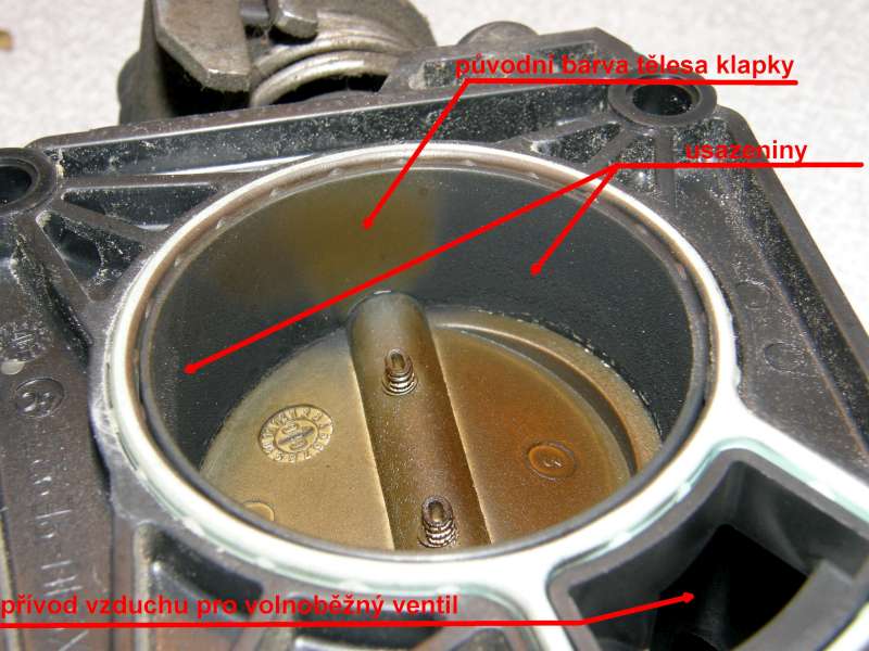 Po sundání hadice sání se na hrdle klapky objeví tento nápis: Opravdu na hraně vlastní klapky a v místě kde klapka uzavírá je nanesena hmota, která je podobná silikonovému tmelu. Asi z důvodů výrobních tolerancí má za úkol klapku v tělese dotěsnit. Dorazový šroub aretuje klapku v uzavřené poloze a hlava šroubu je taktéž zajištěna tmelem proti povolení. Zajímavé je, že klapka ze strany sací hadice je čistá, z opačné strany, tedy ze strany sacího potrubí jsou na tělese klapky patrné usazeniny: Vlastní čištění jsem dělal štětečkem a technickým benzínem, který usazeniny z tělesa klapky odstranil, ale zároveň nepoškodil těsnící tmel kolem klapky. Ta nadále těsní (zkoušeno nalitím tech. benzínu na klapku - po minutě jen nepatrný průsak). Klapku jsem nechal oschnout a montáž proběhla v obráceném pořadí. Jen připomínám, že ten gumový silentblok je dobré potřít nebo postříkat nějakým mazadlem (WD-40, MD-sprej), jde pak lépe nasadit do objímky lanka. Jen stahovací pásku jsem vyměnil za šroubovací, je s ní přeci jen jednodušší práce. Na tu origo nemám kleště.