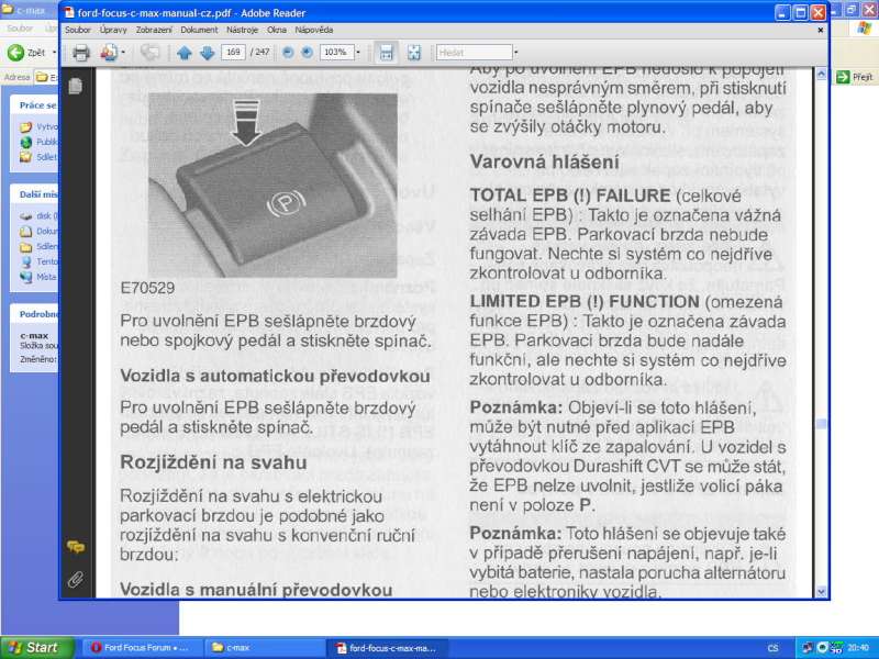 Zdravím Vás všechny, chtěl jsem se po informovat ohledně elektronické parkovací brzdy u Ford Focuse C-Maxe 1,6 TDCI 2005. Byl jsem v neorigo servise a při diagnostice mi našli závadu u čidla el. parkovací brzdy, kterou nešlo vymazat. Brzda funguje normálně. Tak by mě zajímalo co to bude obnášet z finanční stránky pro mě ve Ford servisu, jestli je to nějaká prkotina nebo drážší záležitost. Děkuji za Vaše zprávy.