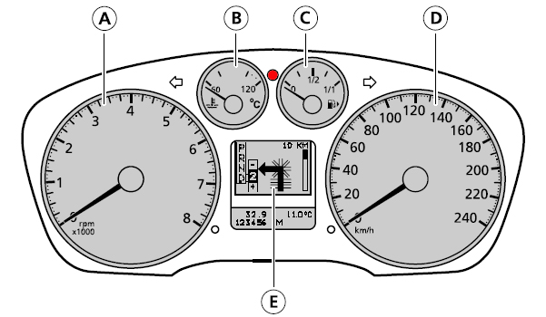 Jakmile jsem nastartoval, tak se mi ale rozsvitila cervena kontrolka mezi chlazenim a palivem. A nasledne pak zacala nepravidelne blikat a svitit apod - po celou dobu jizdy. Vubec netusim co ma tato kontrolka za funkci a v manualu jsem popis pro ni vubec nenasel. Do prilohy prikladam i obrazek palubky, kde jsem tuto kontrolku vybarvil cervene....