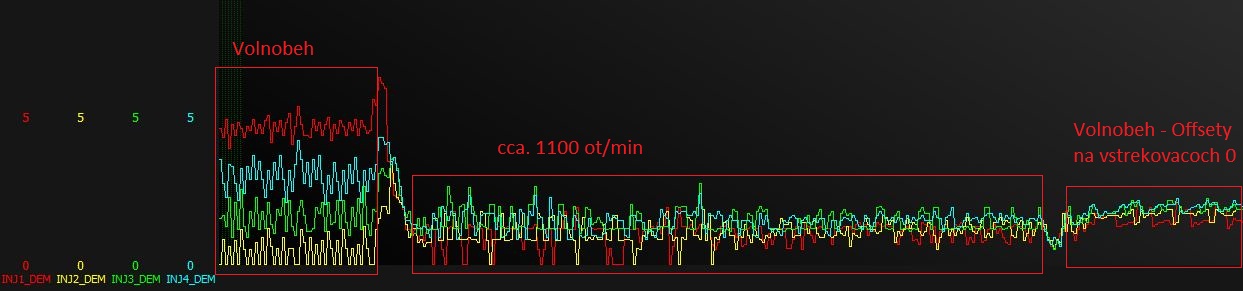 Spravil som zaznam z diagnostiky pri beziacom motore. Zameral som sa na offset jednotlivych vstrekovacov a fuel demand. Vysledky su nasledovne: - Offset (ja to chapem ako korekcia pri vstrekovani aby pri danom mnozstve paliva vstrekovaneho paliva do valca dochadzalo co k najdokonalejsiemu zapaleniu a horeniu zmesi, cim sa dosiahne tichsi chod motora (detonacie vo valci)) na 2-m a 3-m vstrekovaci ukazuju velke korekcie. - Fuel demand (ja to chapem ako palivo potrebne na korektne zapalovanie podla jednotlivych snimacov – hlavne teda oda detonacneho snimaca) na 2-m vstrekovaci je menej a na 3-m vstrekovaci je viac ako na zvysku vstrekovacov.