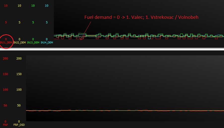 Na diagnostike to vyzeralo takto: - Fuel demand na druhom vstrekovaci boli take nizke az poziadavky klesli na 0, cize vobec tam ako keby nechcel palivo vstreknut.