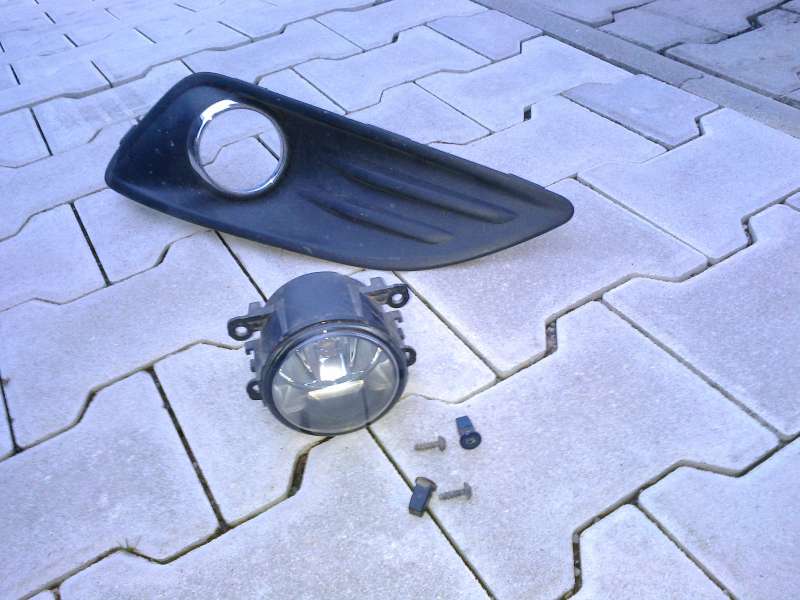 1. pro jistotu kontrola pripravy 2. vyndani krytky - zacit vzadu nahore, lze si pomoc i z druhe strany; nejlepe po odsroubovani obou sroubu drzicich podbeh predniho kola u predniho narazniku 3. usazeni mlhovky - POZOR nasouva se zevnitr smerem ven (snad u vsech ostatnich typu aut je to obracene) 4. nasazeni krytky 5. vymeneni ovladace svetel