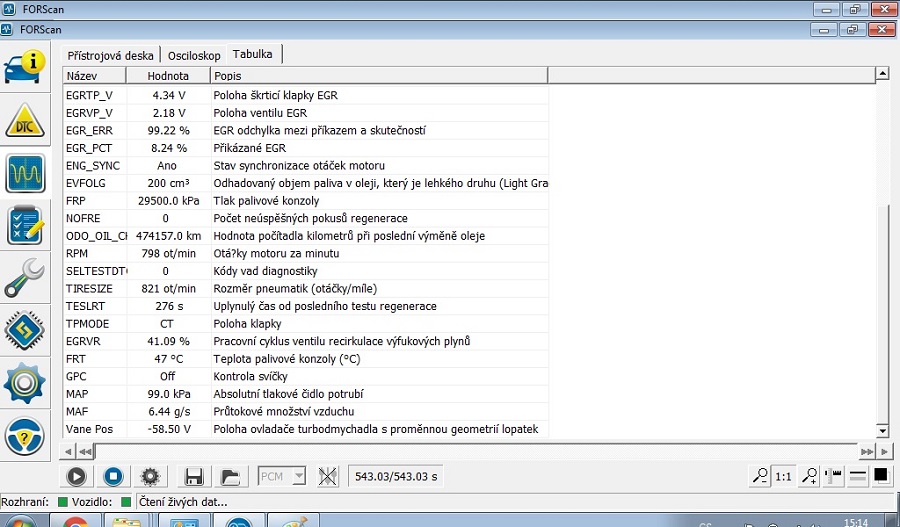 Zvýšení spotřeby nebo únik kapalin jsem nezpozoroval, DTC's jsou čisté, kromě PCM kde byla chyba spojena s výkyvem výkonu alternátoru, ale v době meření se nevyskytovala.
